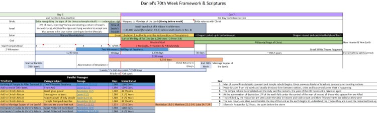 With a general order of events, is there any greater detail that can be found in scripture? There is an amazing collection of passages that all speak to specific periods of time, some of which I’ve touched on already, that actually provide a framework for the 70th week of Daniel. A picture is worth a thousand words, so the chart below lays out the information that will be covered here.