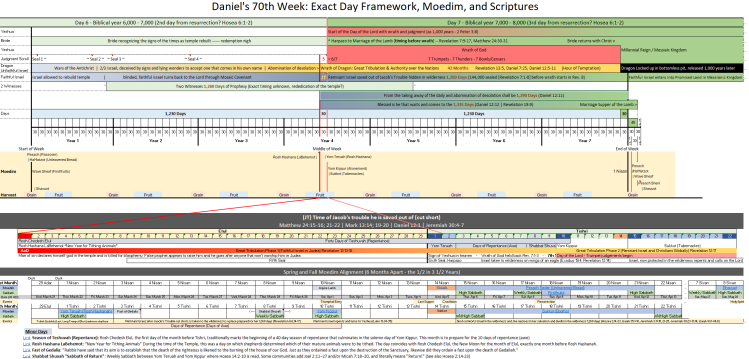 This second chart is the latest iteration that includes the appointed times for Israel, the moedim, and how those tie into the framework of the 70th week, including greater detail on the time being discussed in this article. It sees the season of teshuvah tied with the unparalleled tribulation in Judea, the fulfillment of Yom Teruah in the sixth seal and Yeshua’s return, and the day of the Lord on Yom Kippur, following the ten days of awe/repentance that will see faithful Israel taken to the wilderness and sealed before Yom Kippur. They will celebrate Sukkot in booths in the wilderness where they have been protected from the Dragon.